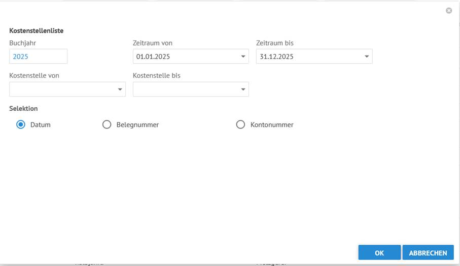 Neben der Auswahl des Zeitraums sowie der Kostenstellen, können Sie hier auch die Anzeigendarstellung selektieren, indem Sie sich die Auswertung entweder nach Datum, der Belegnummer oder auch der Sachkontennummer ausgeben lassen können:
