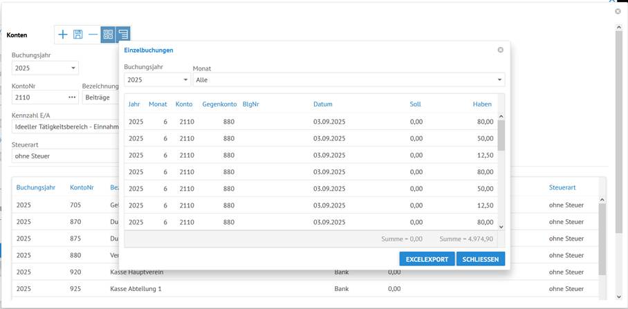Es öffnet sich eine weitere Maske, in der alle Einzelbuchungen angezeigt werden. Diese Übersicht können Sie sich auch nach Excel exportieren, indem Sie auf den Button Excelexport klicken.
