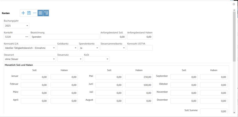 Neben der Auswertung von Einzelbuchungen ist auch die Darstellung der Einnahmen bzw. Ausgaben pro Fibu-Konto als Monatsübersicht möglich.