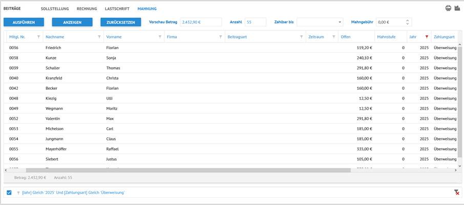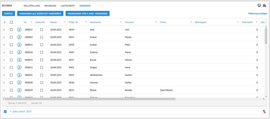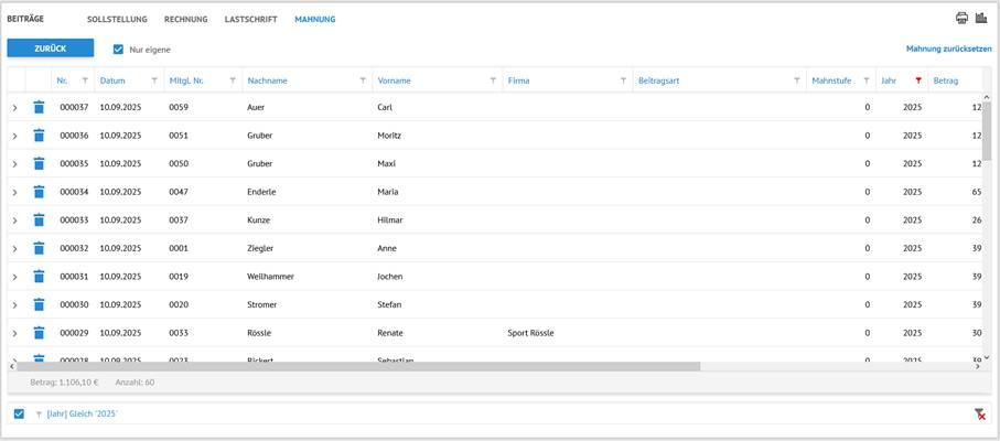 Wenn Sie auf Beiträge > Mahnung gehen, werden Ihnen auf der Übersichtseite alle offenen Posten des aktuellen Buchungsjahres angezeigt.