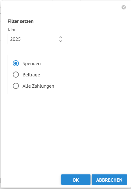 Um festzustellen, was ein Mitglied bezahlt hat, verwenden Sie die Auswertung Protokoll der Zahlungen/Zuwendungen. Diese Auswertung finden Sie unter Beiträge – klicken Sie rechts oben auf das Filtersymbol und klicken Sie den Eintrag an.