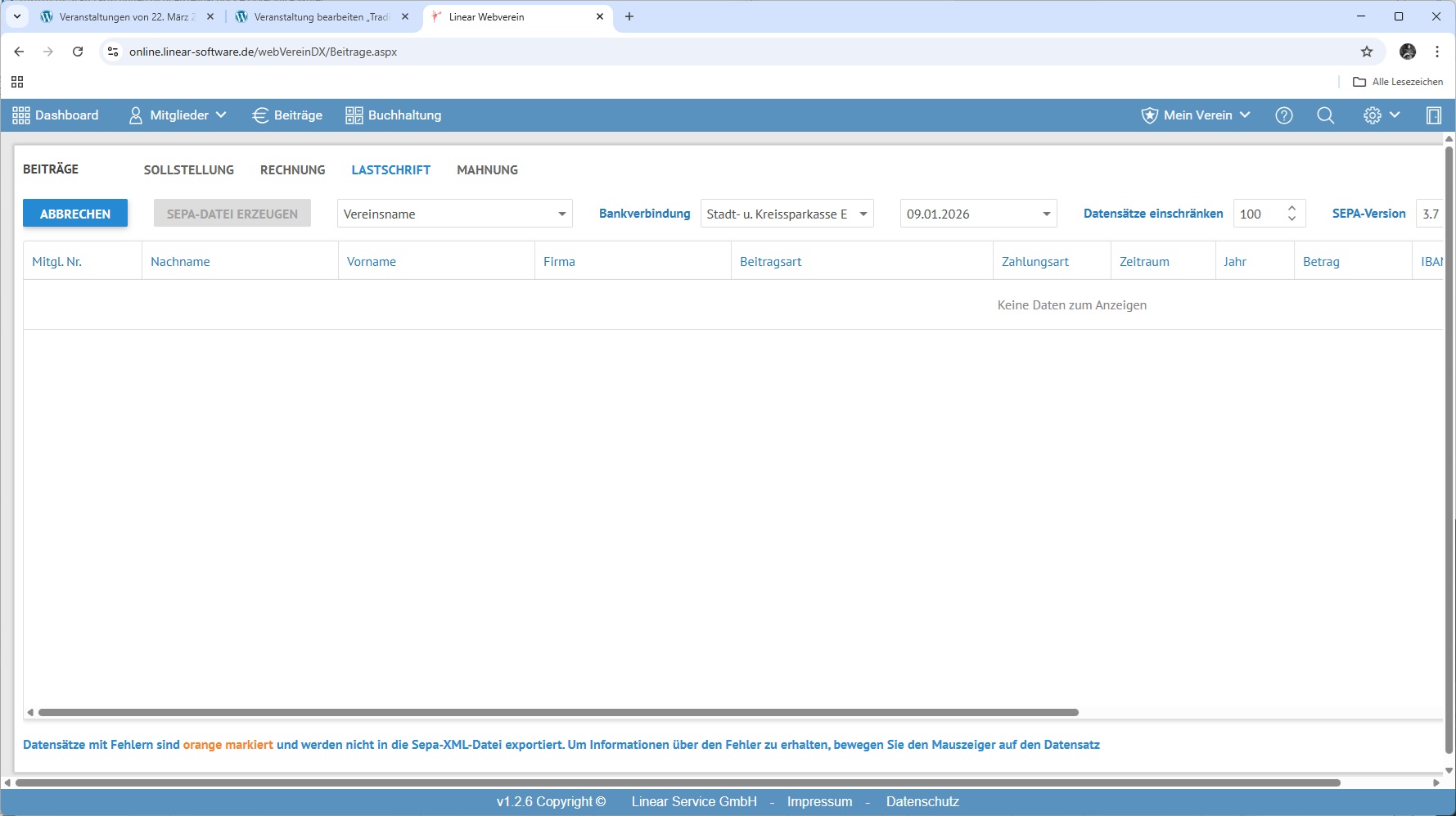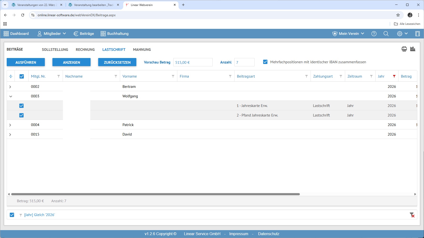 Ich habe die Sollstellungen und einige Lastschriften für das Jahr 2026 erzeugt.