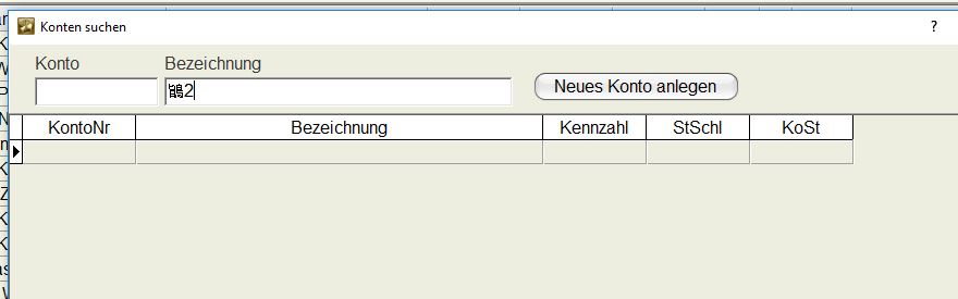 das Problem wurde mit dem aktuellen Service-Release behoben. Wird jetzt die Kontosuche über den 3-Punkte-Button aufgerufen, blinkt der Cursor im Feld Konto und es gibt auch keine "chinesischen" Zeichen mehr im Feld Bezeichnung.