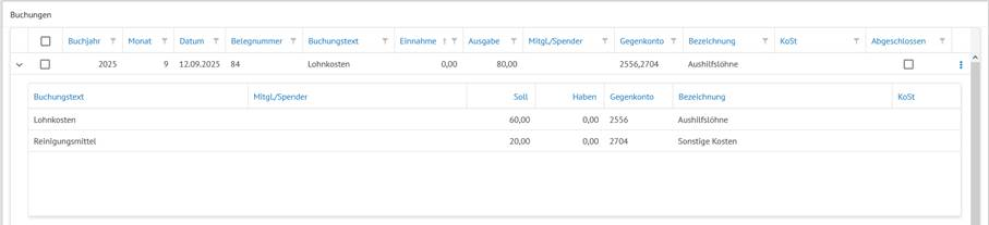 Darüber hinaus sehen Sie auch unter Gegenkonto, auf welche Konten die Buchung aufgeteilt wurde.