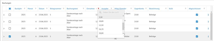 Sie suchen z. B. nach einem Einnahmebetrag in Höhe von 3,50 €. Setzen Sie einen entsprechenden Filter im Feld Einnahme: