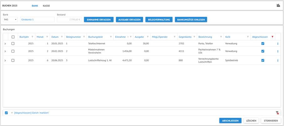 Wird über Buchhaltung die Buchungsübersicht geöffnet, sehen Sie alle Ihre getätigten Buchungen. Dabei steht der zuletzt gebuchte Vorgang stets an oberster Stelle. Ob eine Buchung nur gespeichert - d.h. noch nicht abgeschlossen ist, erkennen Sie daran, dass in diesem Fall noch kein Häkchen in der Spalte „Abgeschlossene“ neben dem Buchungseintrag gesetzt wurde.