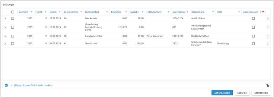 Um Buchungen abzuschließen, setzen Sie einen Filter in der Spalte „Abgeschlossene“ auf „Nicht abgeschlossen“: