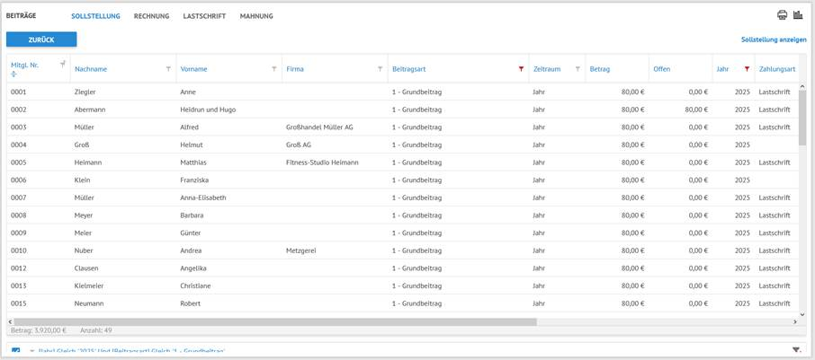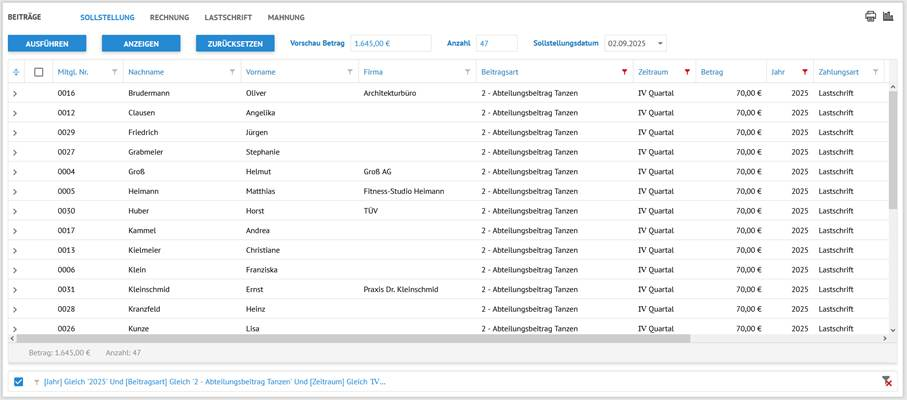 Filter Beitragsart „Abteilungsbeitrag Tanzen“ selektiert zunächst alle möglichen Sollstellungen der ausgewählten Beitragsart. Der Filter Jahr „2025“ schränkt die Anzeige auf den aktuellen Sollstellungszeitraum ein. Der Filter Zeitraum IV Quartal sorgt dafür, dass nun in der Übersicht alle Mitgliederdatensätze gezeigt werden, für die der Abteilungsbeitrag Tanzen für das IV. Quartal fällig gestellt werden kann – also eine Sollstellung erzeugt werden kann.