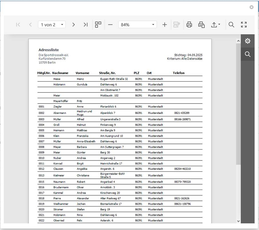 Die Adressliste einfach beinhaltet zum Beispiel die Felder: Mitgliedsnummer, Nachname, Vorname, Straße, Hausnummer, Postleitzahl, Ort und Telefonnummer.