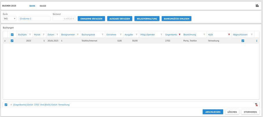 Filter Gegenkonto „2702“ schränkt die Anzeige der Buchungen auf das Konto 2702 ein. Der Filter Kost „Verwaltung“ beschränkt die Auswahl auf alle Buchungen die außerdem auf die Kostenstelle „Verwaltung“ gebucht wurden.