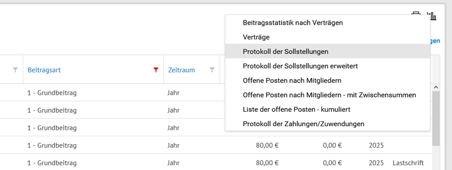 Unter dem Menüpunkt Beiträge -> Sollstellung finden Sie alle Listen rund um Ihre Beiträge, Sollstellungen, Lastschriften, Rechnungen und Mahnungen: