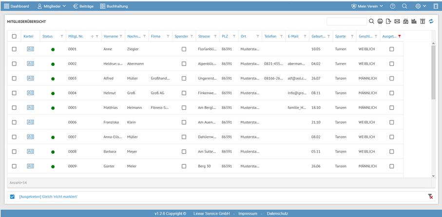 Um Mitgliederlisten auszugeben, öffnen Sie den Bereich Mitglieder -> Mitgliederübersicht.