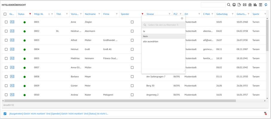 Die Auswertung nehmen Sie analog zur Mitgliederverwaltung vor. Filtern Sie die Ergebnisse wie oben im Beispiel gezeigt.