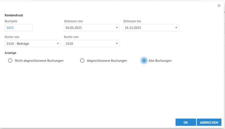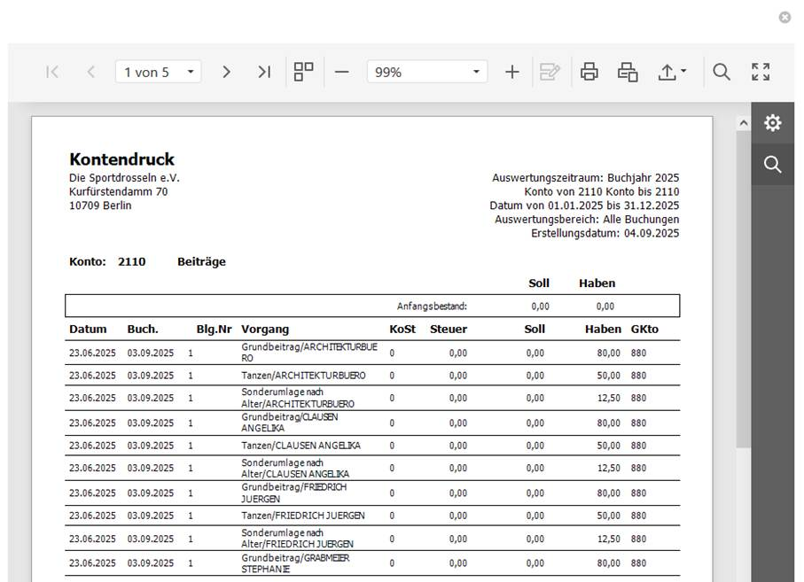 Außerdem können Sie die Auswertung auch auf z.B. nur ein Sachkonto beschränken – hier das Beitragskonto 2110. Mit Klick auf OK erhalten Sie dann die Auswertung.