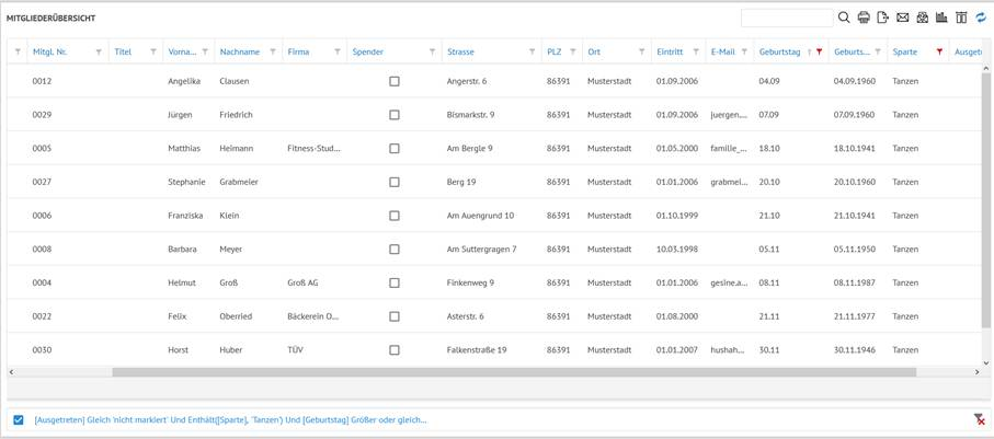Setzen Sie in der Mitgliederübersicht einen Filter auf die Sparte „Tanzen“ und unter „Geburtstag“ einen Filter vom 01.09. bis 31.12. und Sie erhalten das Ergebnis in der Übersicht angezeigt: