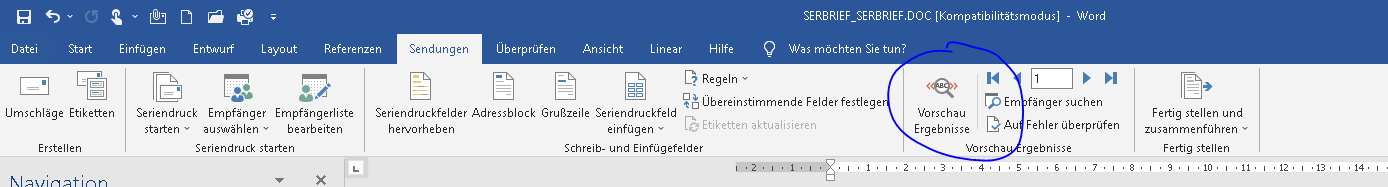 Bei Serienbriefen ist das etwas anders. Da wird die Vorlage mit den Platzhaltern angezeigt und wenn man dann oben im Dokument auf "Vorschau Ergebnisse" klickt, werden die Platzhalter befüllt. Ich habe Ihnen einmal einen Screen davon angehängt.