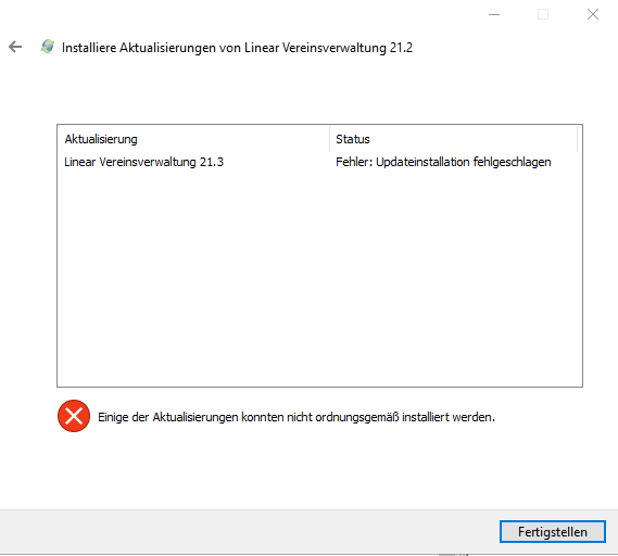 Hallo, habe heute mehrmals versucht das Linear Vereinsverwaltung Update 21.3. auf meinem Server 2019 zu installieren, leider ohne Erfolg, Fehlermeldung lautet: Einige der Aktualisierungen konnten nicht ordnungsgemäß installiert werden (s. auch Anlage), Fehler bekannt, gibt es eine Lösung?