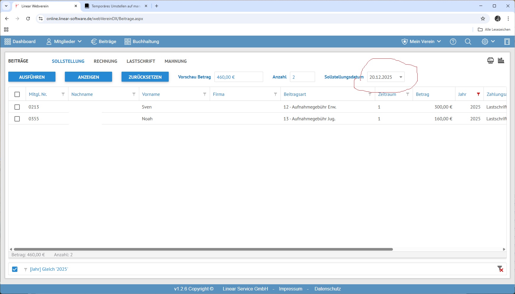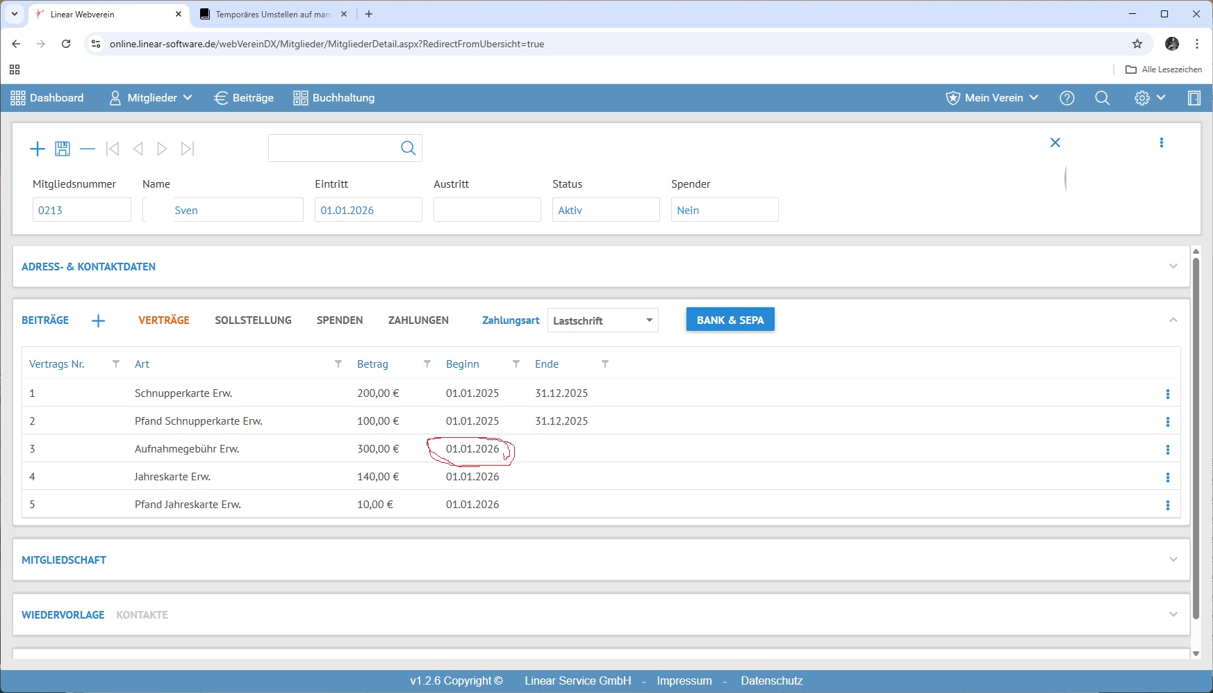 Ich habe vor kurzem bei neuen Mitgliedern die Verträge für die Aufnahmegebühr zum 01.01.2026 angelegt.