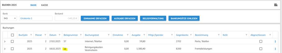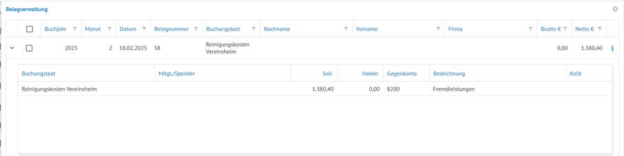 Der Beleg wird zudem in der Buchungsübersicht über die Belegnummer verlinkt und kann mit Doppelklick geöffnet werden: