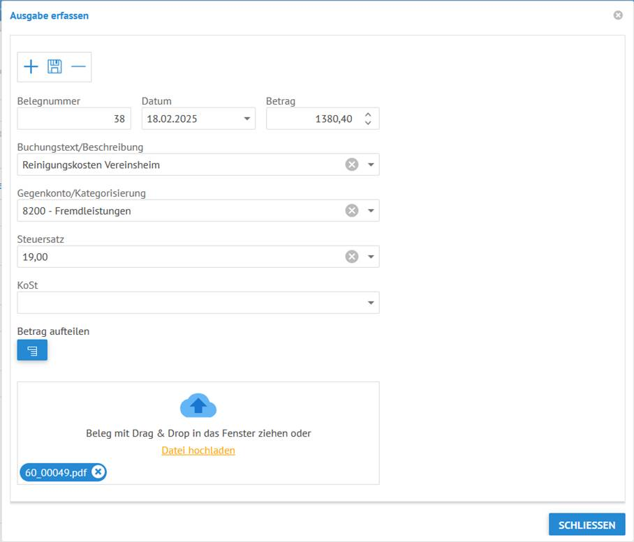 Speichern Sie Ihre Ausgabenbuchung. Dabei wird der Beleg dann automatisch in die Belegverwaltung übernommen.