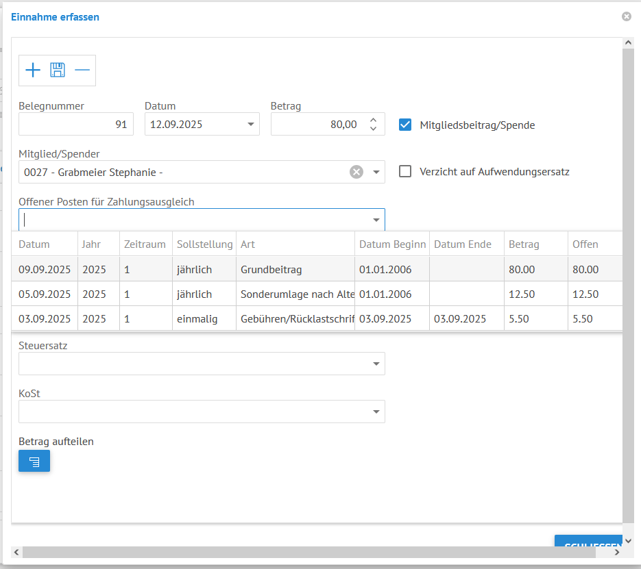Klicken Sie auf das Dropdown-Pfeilchen im Feld „Offener Posten für Zahlungsausgleich“ – es werden Ihnen die offenen Posten des Mitglieds angezeigt.