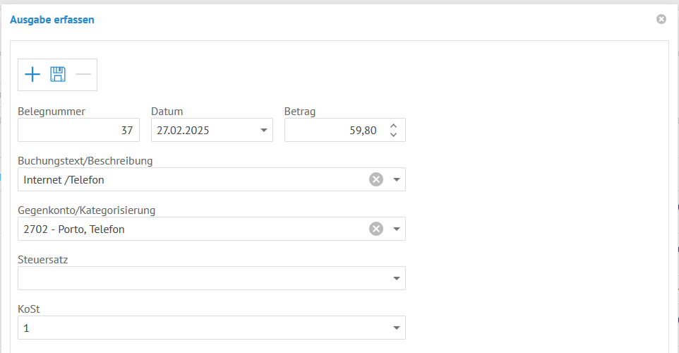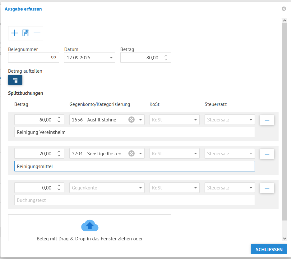 Speichern Sie Ihre Ausgabenbuchung. Dabei wird der Beleg dann automatisch in die Belegverwaltung übernommen.