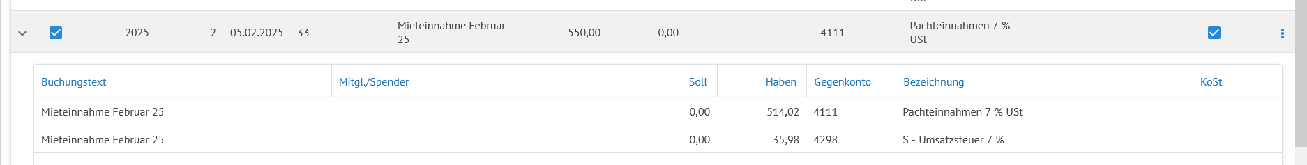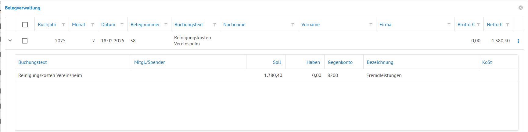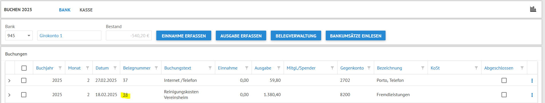 Der Beleg wird zudem in der Buchungsübersicht über die Belegnummer verlinkt und kann mit Doppelklick geöffnet werden: