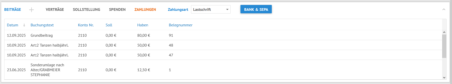 Mit der Buchung der Beitragszahlung wird beim Mitglied im Mitgliederdatensatz im Abschnitt Beiträge eine Zahlung angelegt: