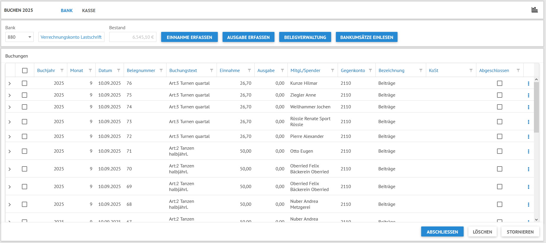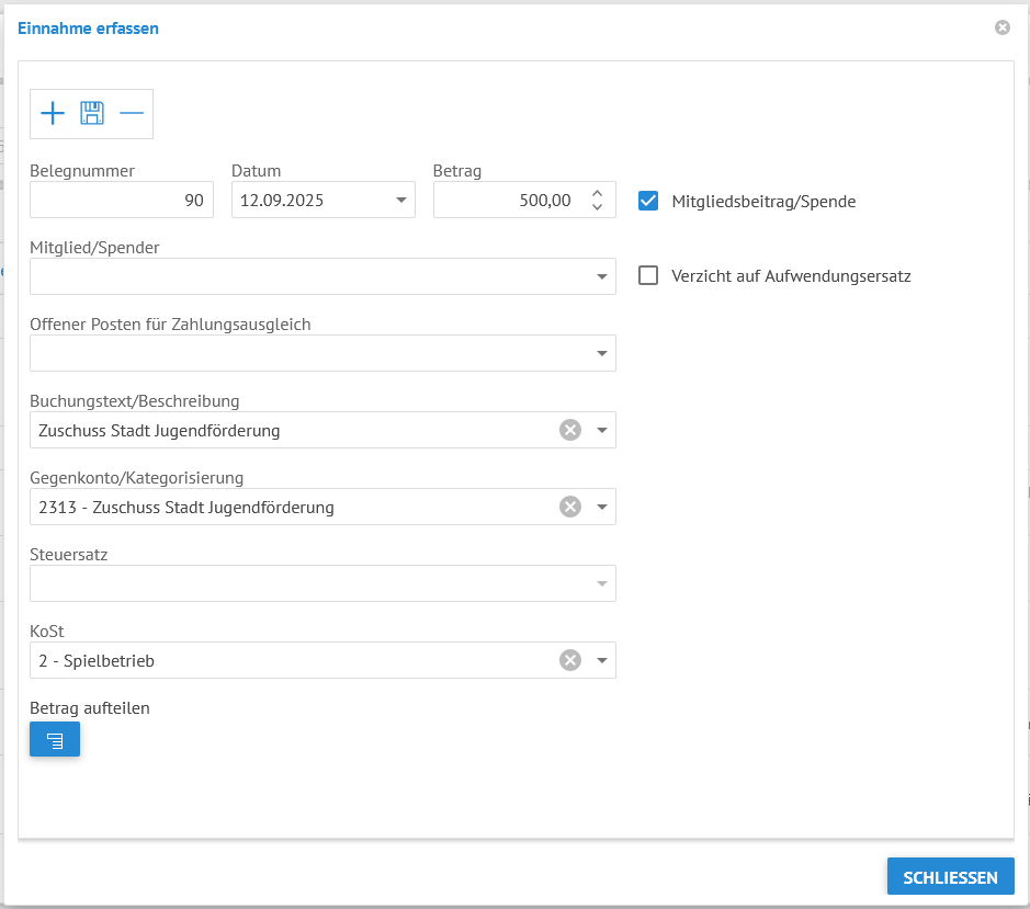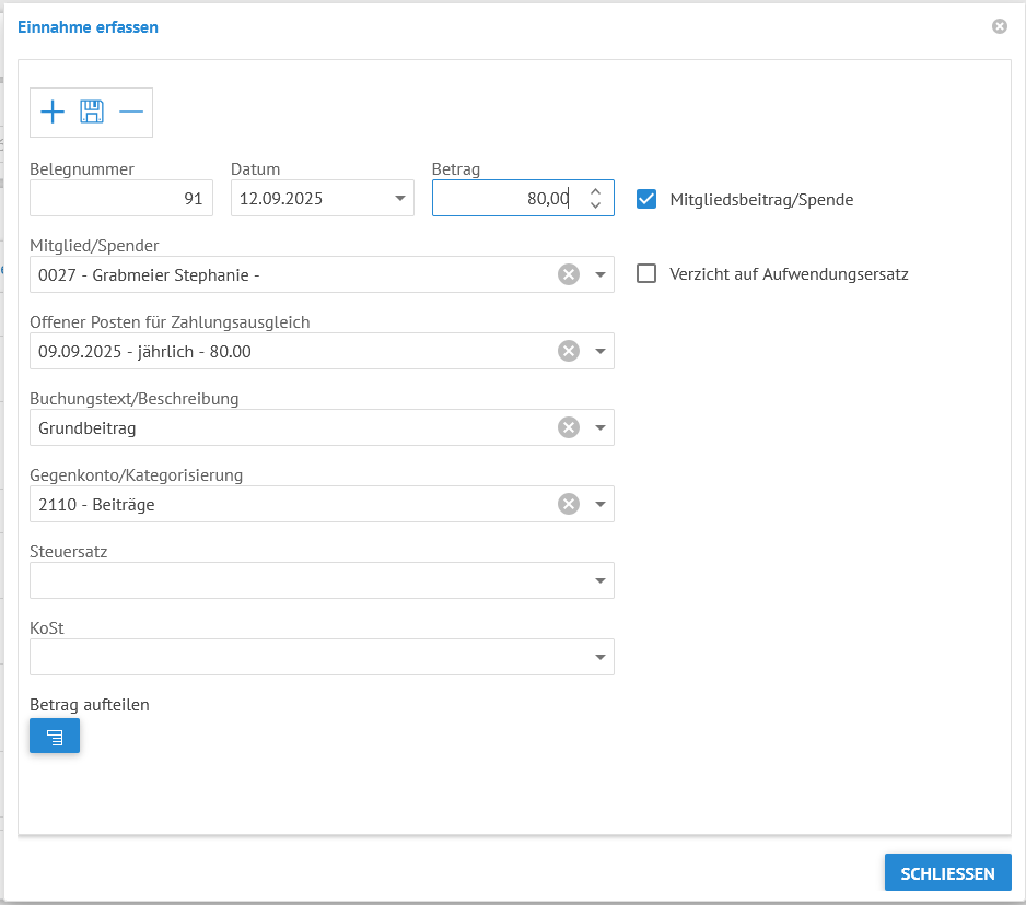 Die Erfassungsmaske bleibt für Verbuchung weiterer Einnahmen geöffnet. Sind alle Einnahmen gebucht, schließen Sie die Maske mit Klick auf den Button Schließen.