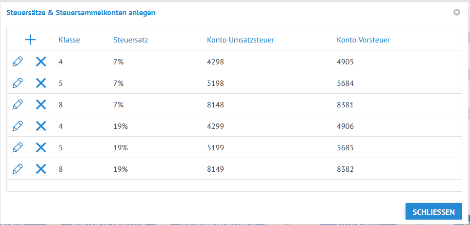Hier sehen Sie die bereits hinterlegten Steuersammelkonten – sollten diese bei Ihnen noch nicht eingetragen sein, klicken Sie auf das Pluszeichen und tragen Sie die Kontenklasse ein, wählen den Steuersatz aus und wählen dann über den jeweiligen Drei-Punkte-Button noch das passende Steuersammelkonto aus. Die Steuersammelkonten sind bereits im Kontenplan hinterlegt.
