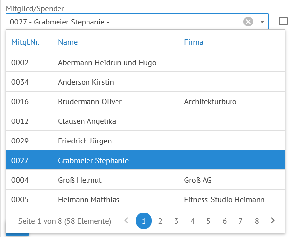 Wählen Sie das Mitglied aus, welches seinen Beitrag bezahlt hat, indem Sie entweder die Mitgliedsnummer eintippen oder den Namen eintragen – es öffnet sich dann eine entsprechende Auswahlmaske: