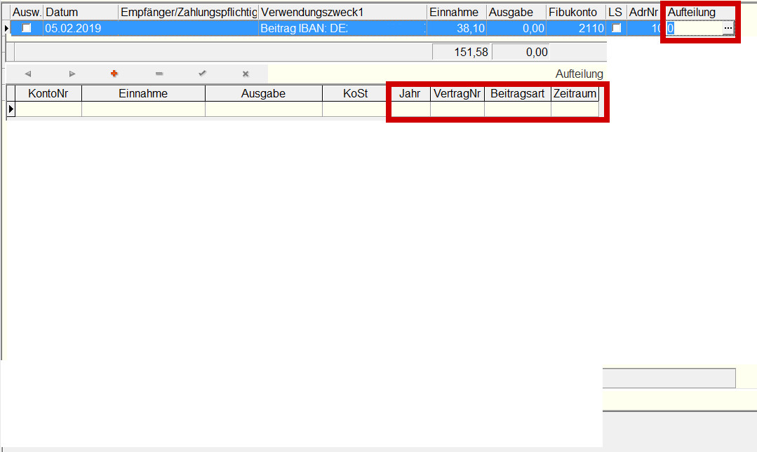 1.) Die Zahlung manuell über den Dreipunkt-Button "Aufteilung" zu erfassen, allerdings müssen hierzu u. a. die Angaben bzw. Daten zu den Bereichen Einnahme, VertragNr, Beitragsart und Zeitraum bekannt sein. Durch das Drücken der Taste F12 lassen sich zwar die offenen Beträge bzw. benötigten Daten ermitteln, aber komfortabel ist dies nicht.